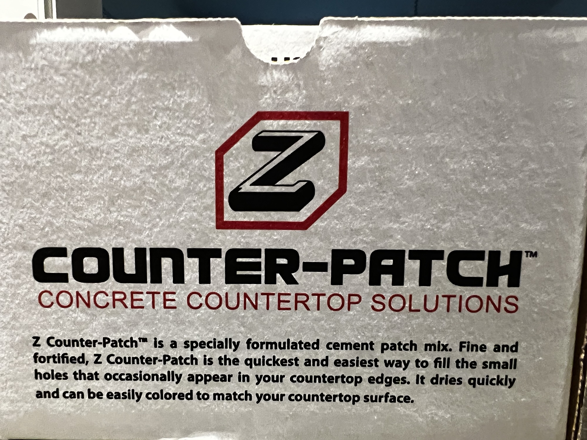 My first brilliant idea was to use Top ‘n Bond Concrete Patcher. The package said “for application thickness under 1/2 inch” which seemed perfect since I needed it to blend seamlessly with the existing counter.