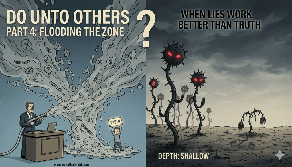 The Techniques: 1. Accusation in a mirror (projection) 2. Firehose of falsehood (multiple contradictory stories) 3. First-mover advantage (control the narrative before facts emerge) 4. Flooding the zone (too much to fact-check) 5. Creating alternative reality (deny video evidence) 6. Weaponizing “fake news” (destroy truth arbiters)