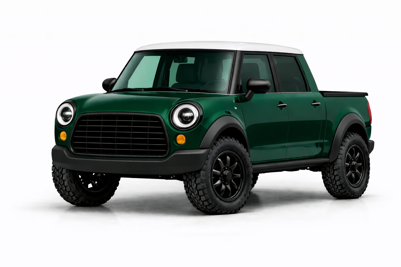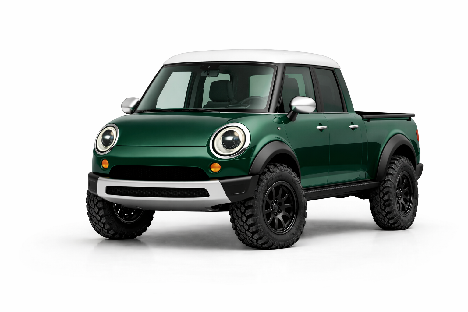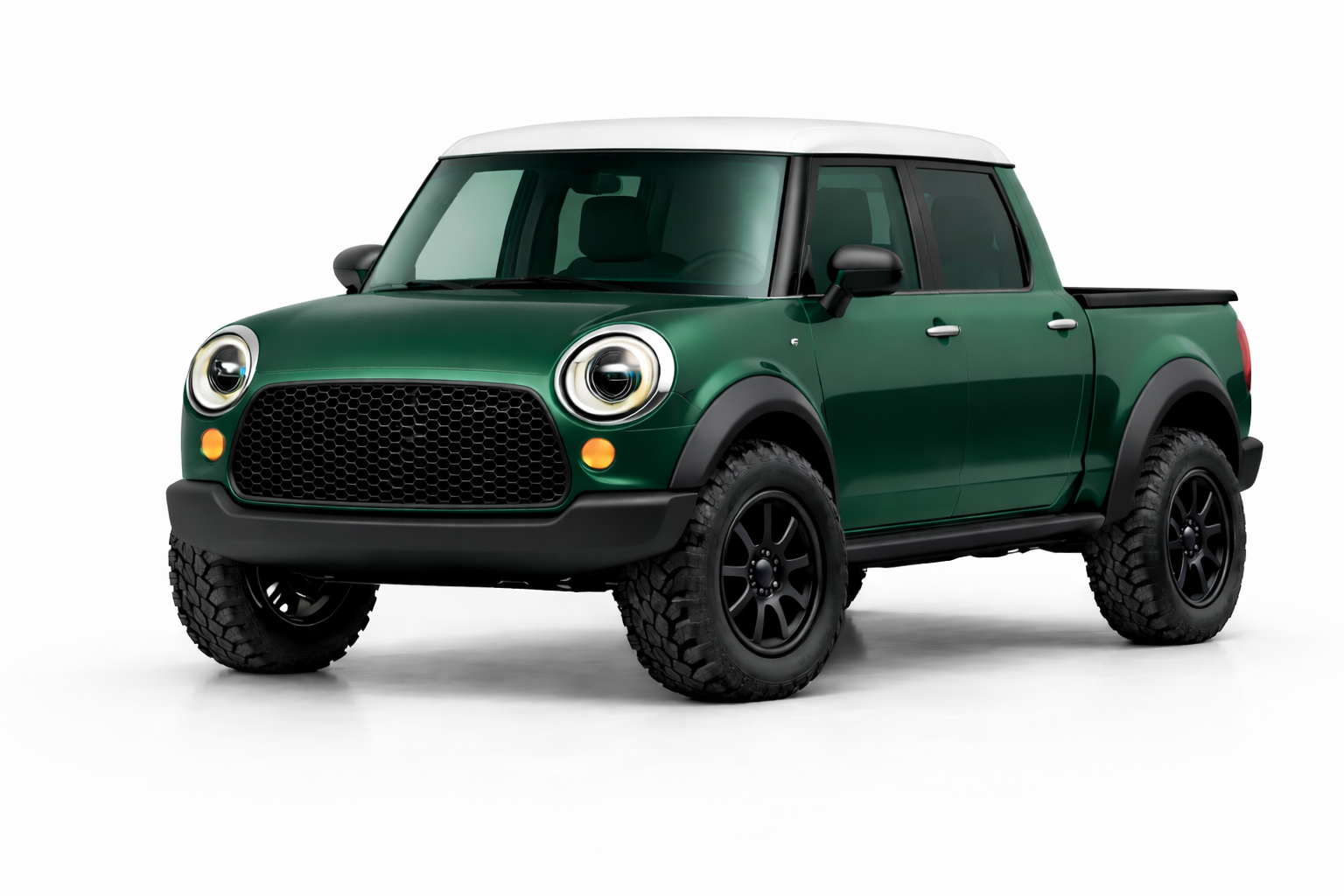 The concept I kept coming back to: take the Telo’s fundamental architecture — crew cab, short bed, compact footprint, EV powertrain — and dress it in the rounded retro-modern design language that the original Mini, the VW Beetle, and the VW Microbus all share. Soft round body lines. Large circular LED headlights. Smooth closed-off front fascia — it’s an EV, the grille can go. Gently flared wheel arches. Two-tone paint — British Racing Green with a white roof if you want to commit to the bit. Crossover stance. A vehicle that looks equally at home in the mountains or in a city parking garage.