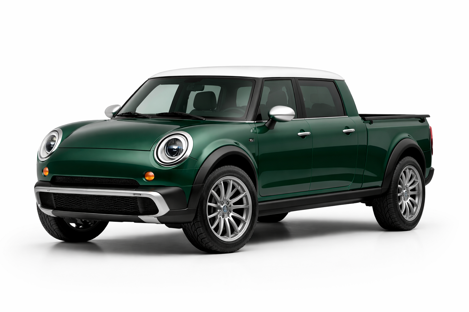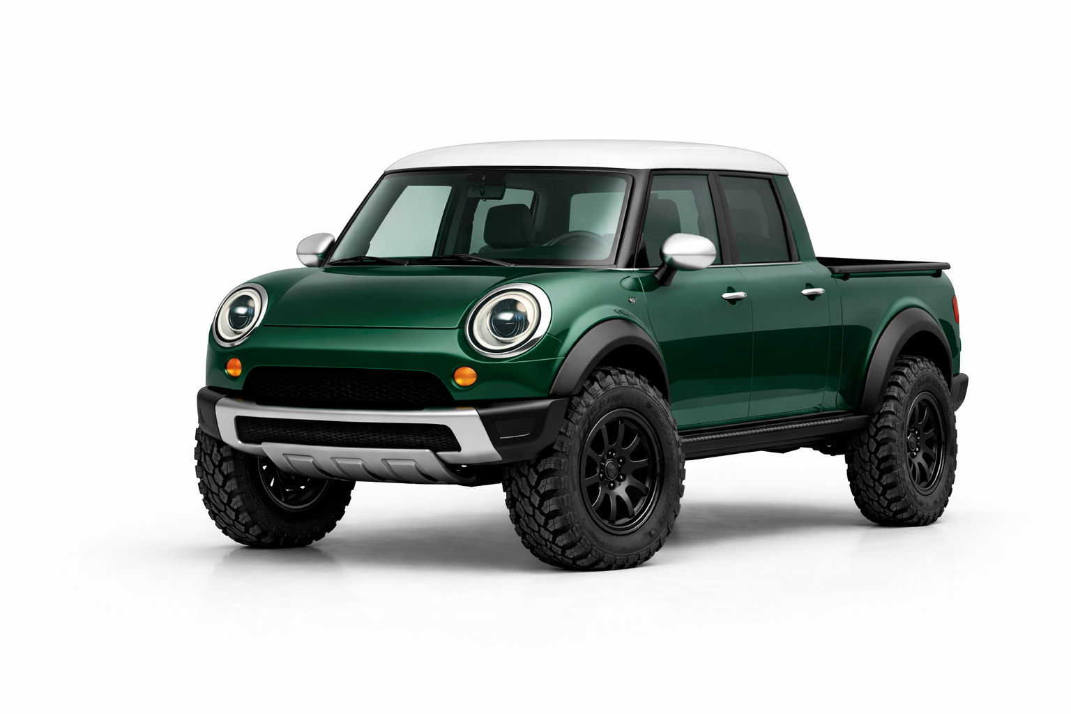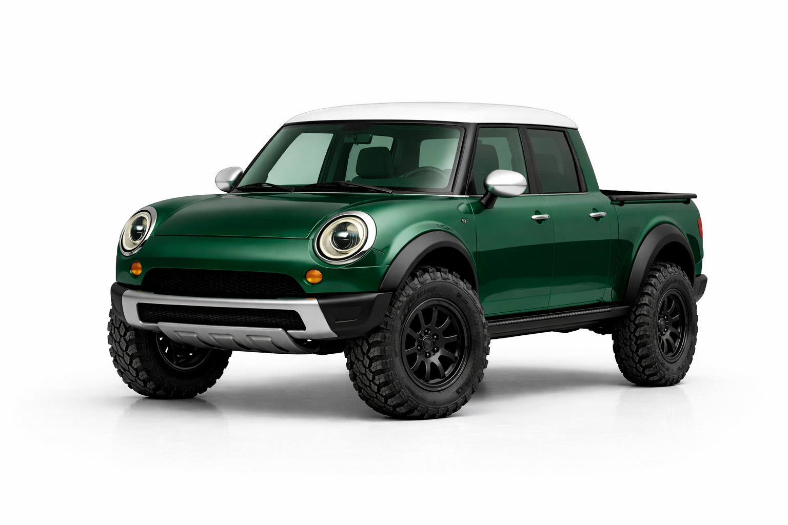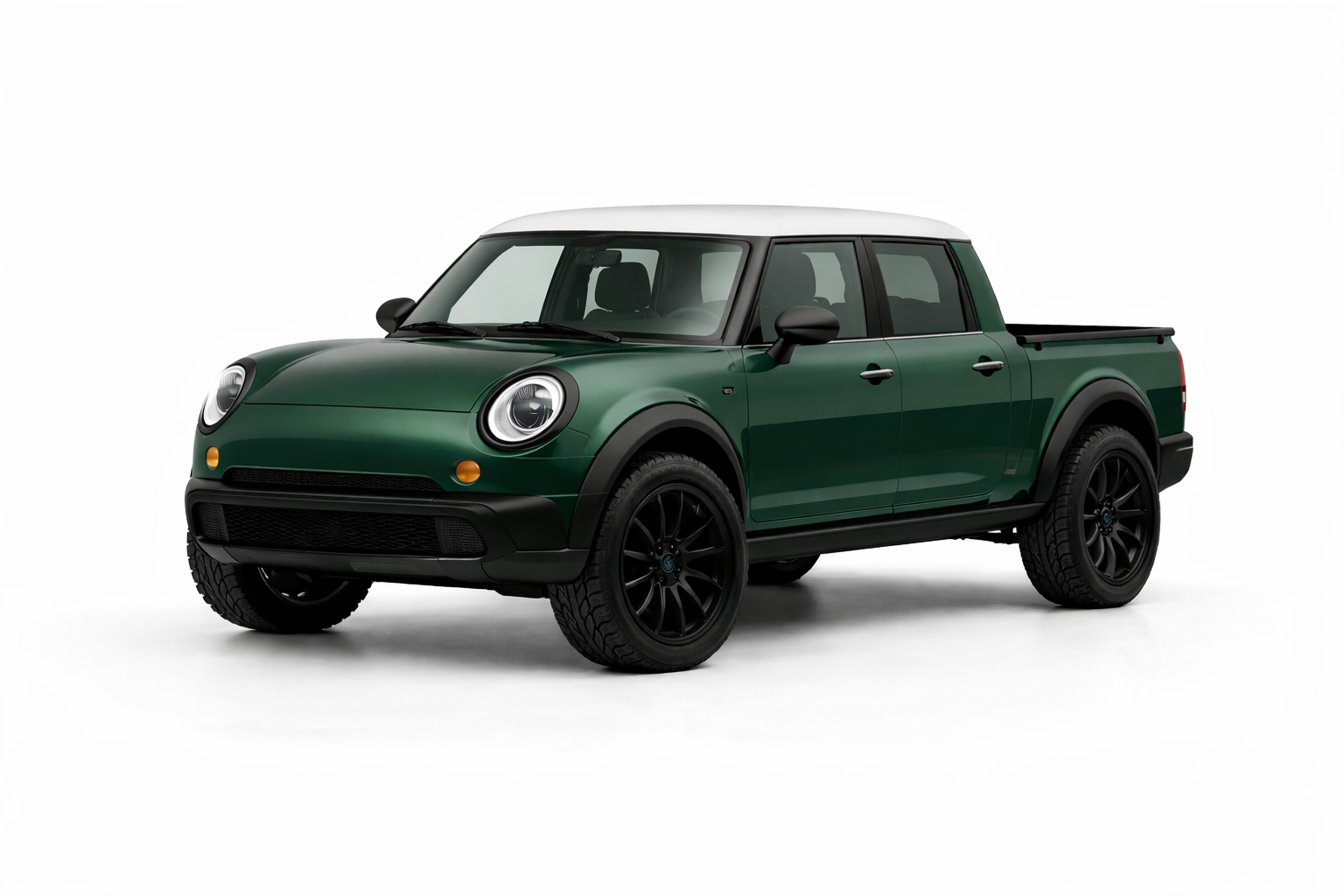 The concept I kept coming back to: take the Telo’s fundamental architecture — crew cab, short bed, compact footprint, EV powertrain — and dress it in the rounded retro-modern design language that the original Mini, the VW Beetle, and the VW Microbus all share. Soft round body lines. Large circular LED headlights. Smooth closed-off front fascia — it’s an EV, the grille can go. Gently flared wheel arches. Two-tone paint — British Racing Green with a white roof if you want to commit to the bit. Crossover stance. A vehicle that looks equally at home in the mountains or in a city parking garage.