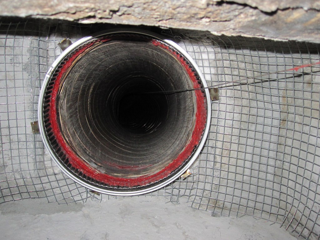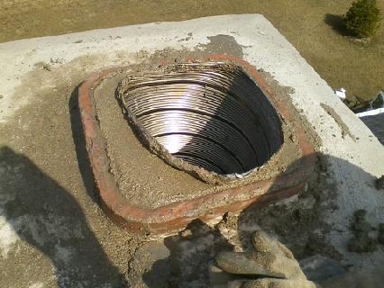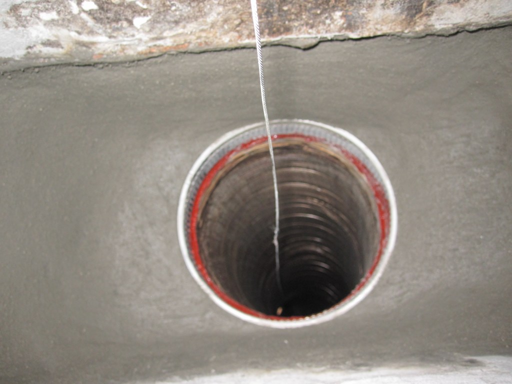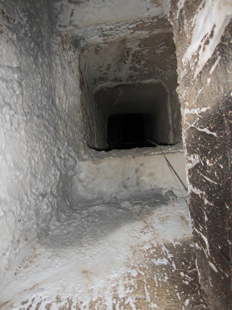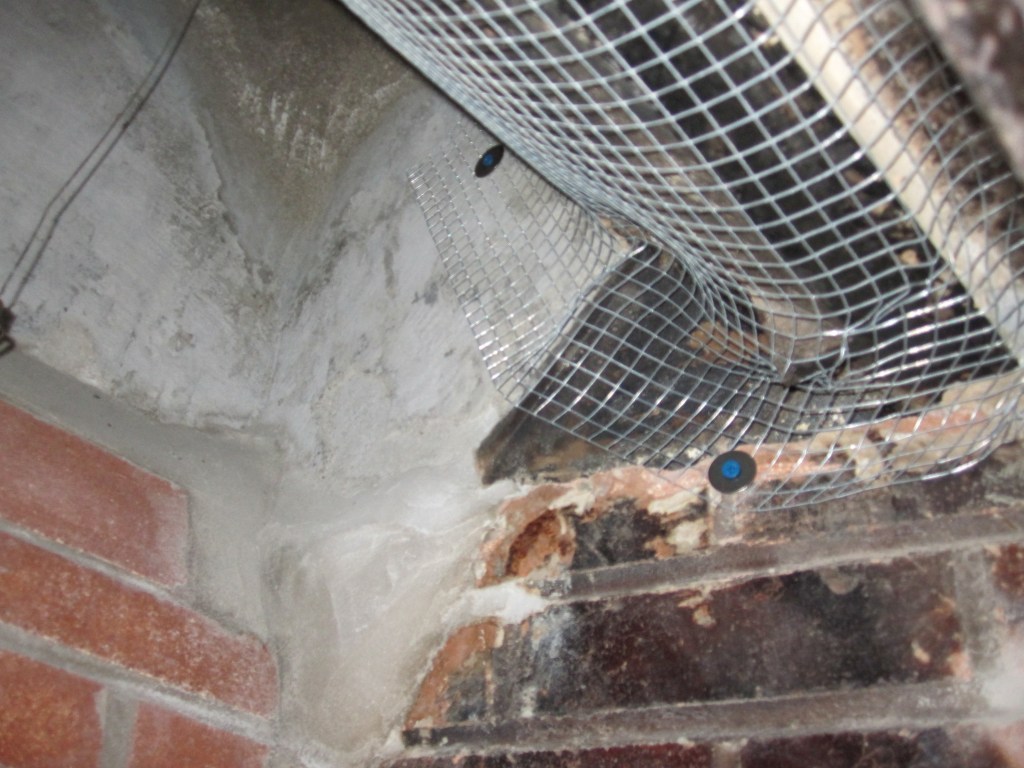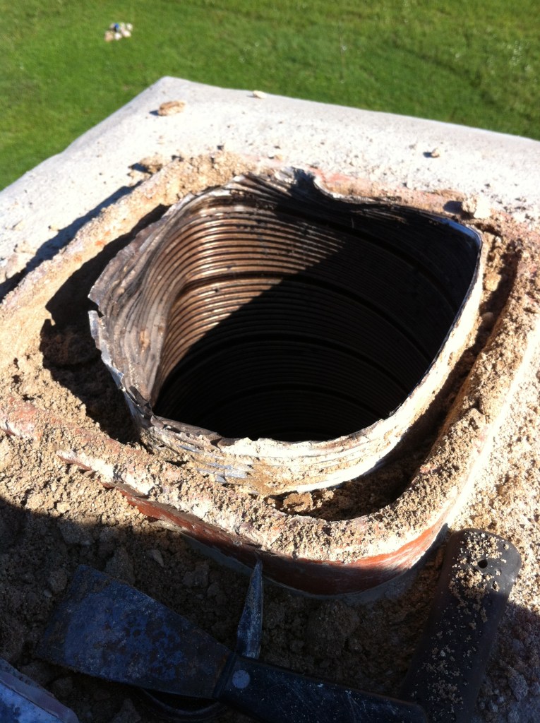 I bought the materials. I got into the smoke chamber — which is, in case you’ve never been inside one, a claustrophobic, soot-covered, extremely unpleasant space — and I chiseled out as much of what the liner guy had done as I could get. I also discovered that the concrete guy had used the old throat damper as structural support for the smoke chamber, which meant I couldn’t remove it, which meant I was working around it. I bought an electric chisel to get through some of what needed to come out. I parged the smoke chamber with the refractory material. I installed a proper stainless steel cap and termination at the top and bottom of the liner.