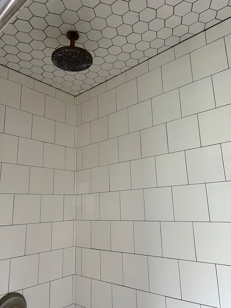 For tile, I pushed for Subway Ceramics — the same company we used in the kitchen, the ones who still make the original spec thick flat-back subway tile from the transit era, nearly invisible grout lines, exactly right. Jennifer thought that look might be overdone. I didn’t care, and made the argument I make every time someone wants to build for resale rather than for themselves: you can’t design a house for what a future buyer might want. They’ll rip it out anyway. Do what fits the house. The walls are 6×6 Subway Ceramics (easy to clean) with all the corner trim pieces — bullnose edges, finished corners — so everything terminates cleanly. The floor is 2-inch black marble hex with black grout and a black marble threshold. The ceiling is 3-inch Subway Ceramics hex. We tiled it because the shower is enclosed enough that you’d notice if we didn’t, and once you commit to Subway Ceramics on the walls it would feel wrong to stop.