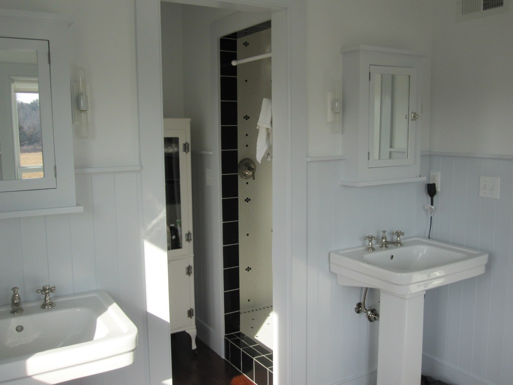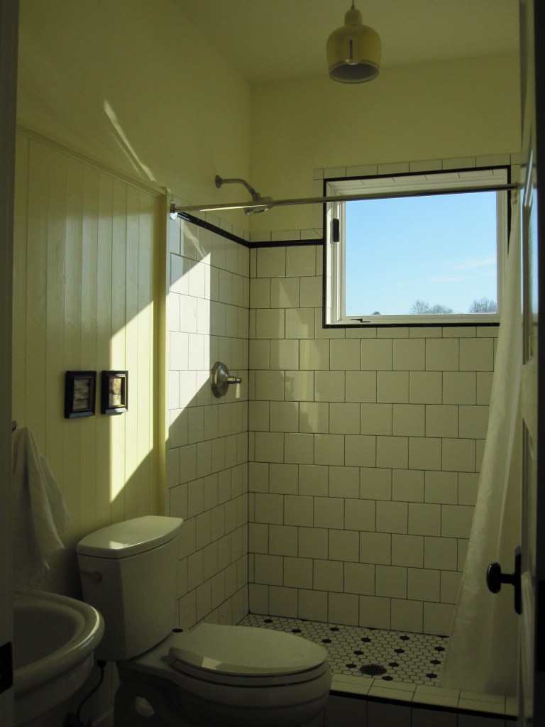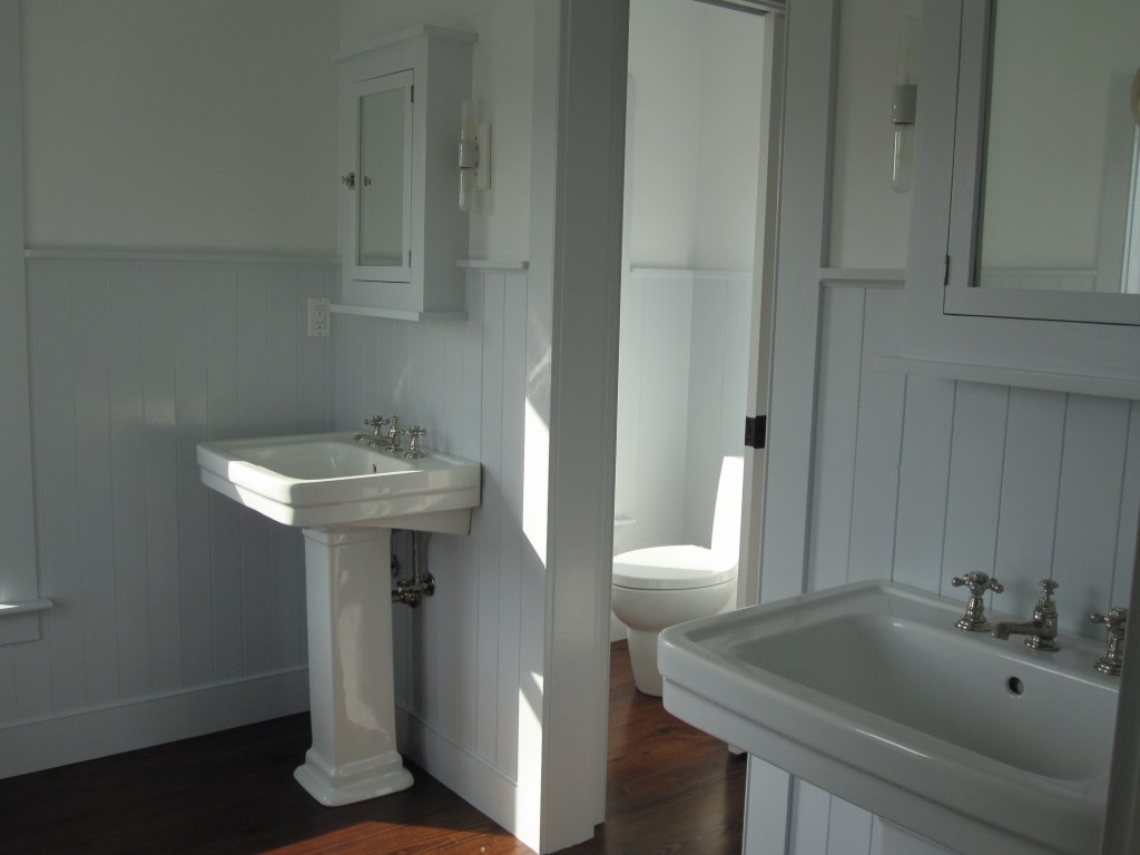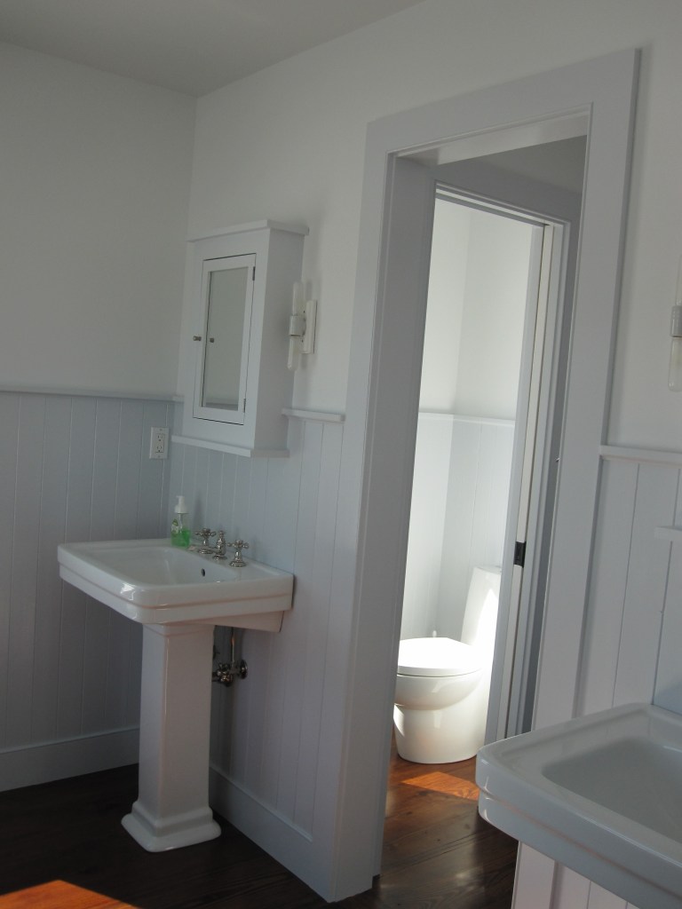 The layout otherwise followed the house. Upstairs, two bedrooms share one bathroom — that’s the kids’ bathroom, and has been for years. On the master side of the second floor, there’s a private bath off the bedroom, with a separate water closet for the toilet. That last part was Jennifer’s call and she was right, as usual.