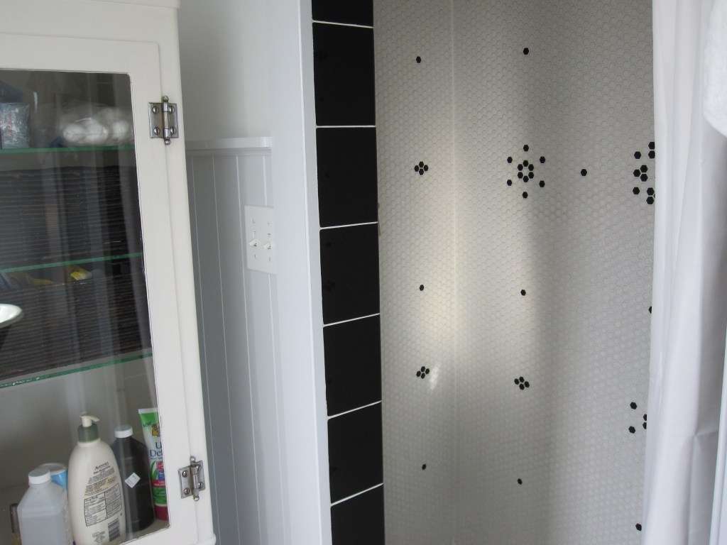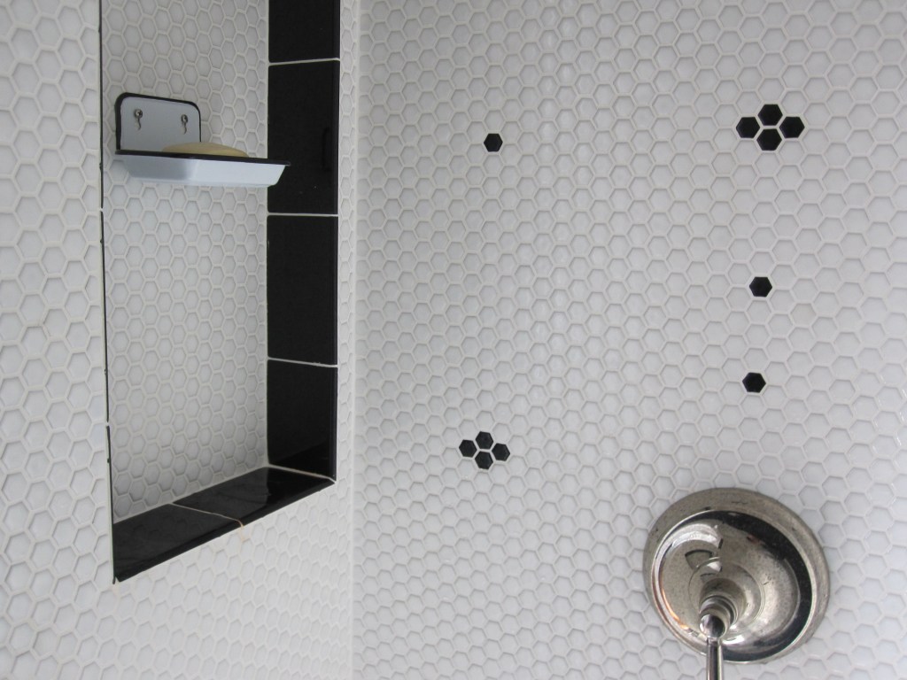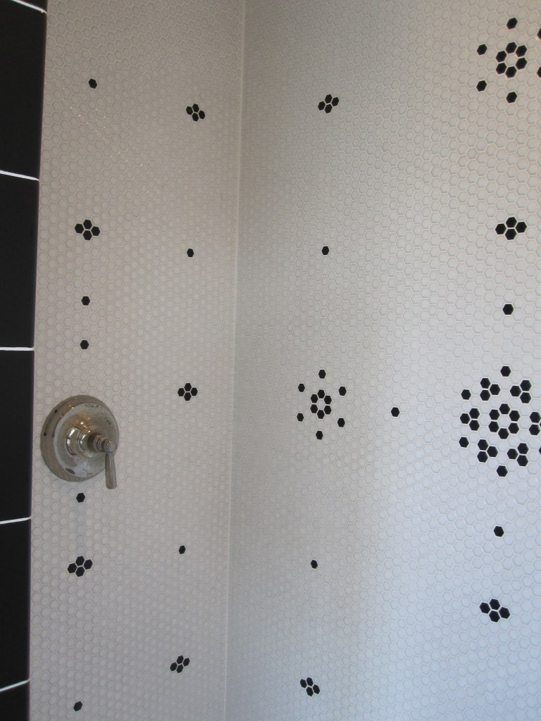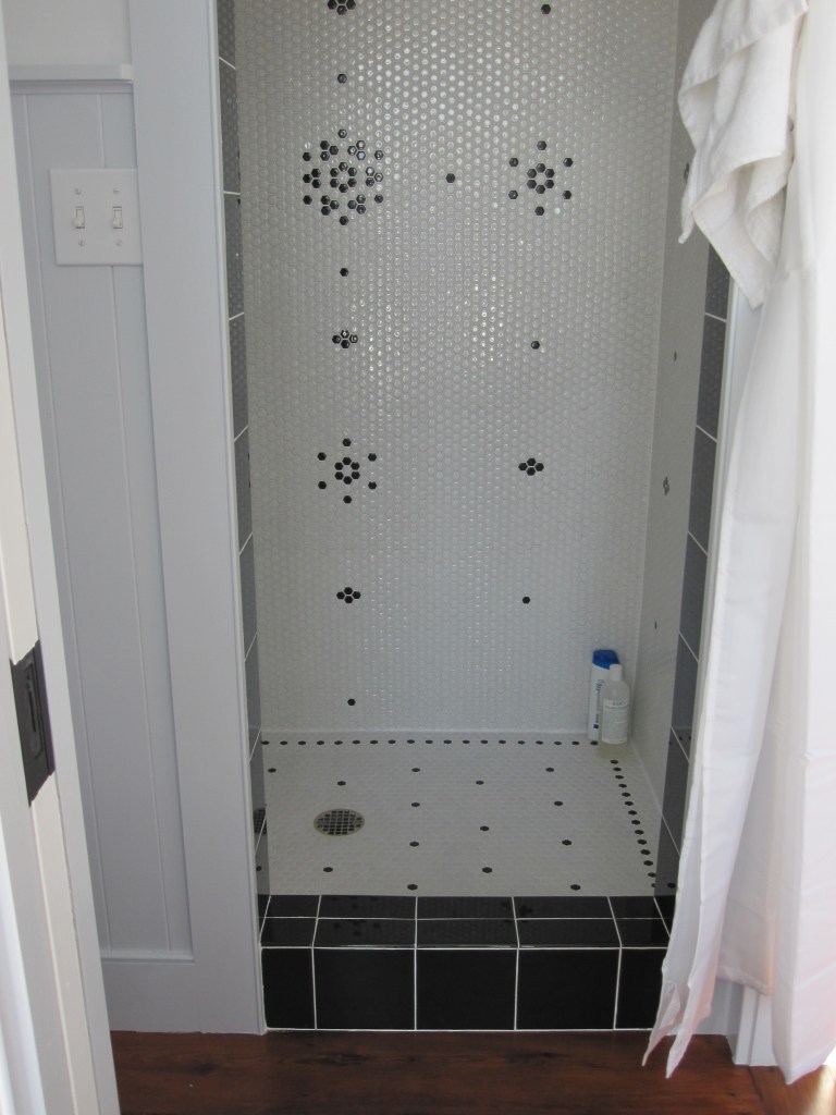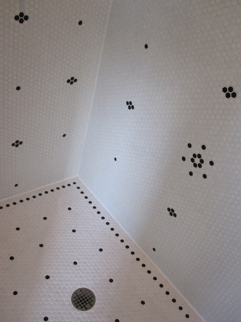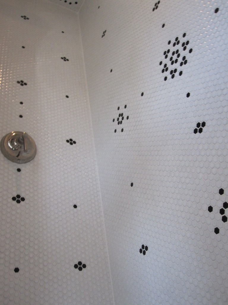 The original master shower was small hexagonal tile — about an inch — white, with black tiles Jennifer had worked into a flower pattern in a few places across the walls. To execute the pattern while we were in the city and our friend was up here working alone, we laid the whole thing out on the floor of the house so he could see exactly where each black tile went before he started. That part was actually kind of elegant as a solution.