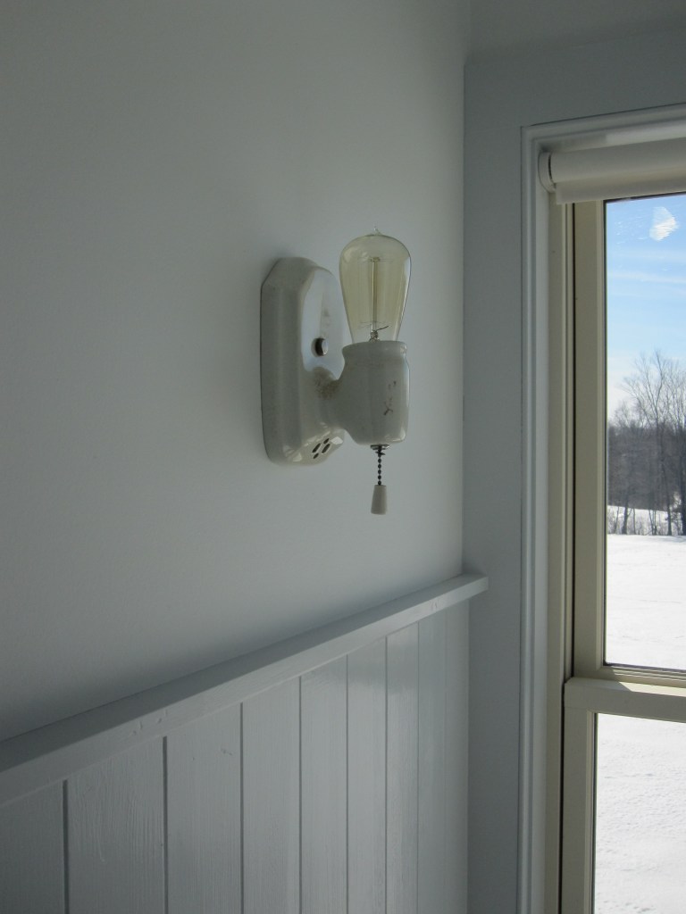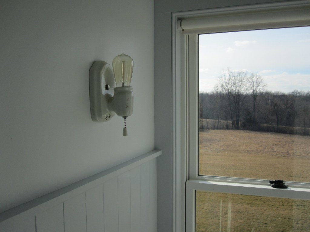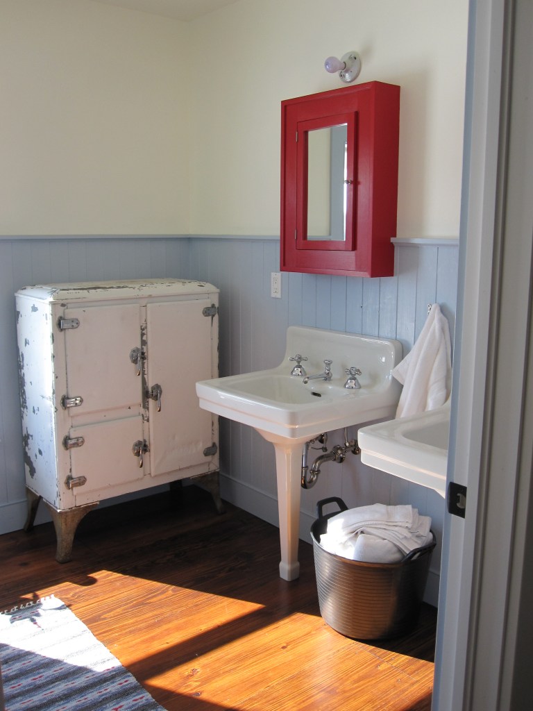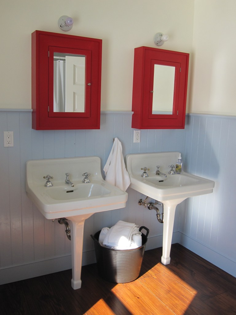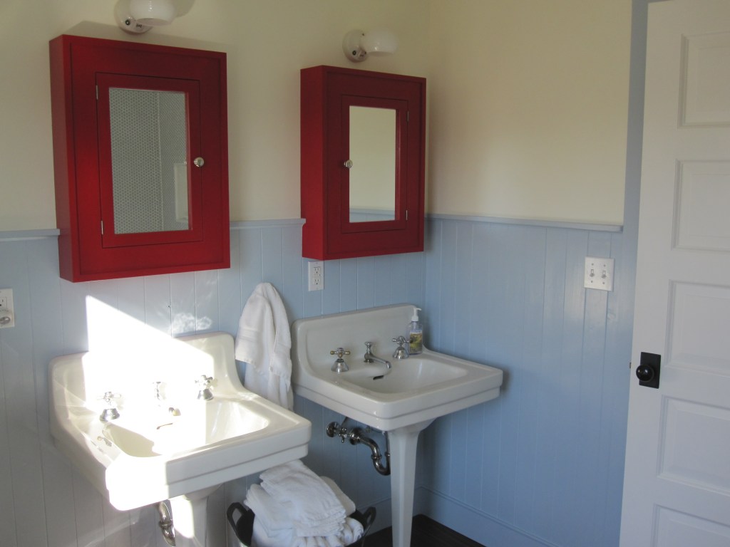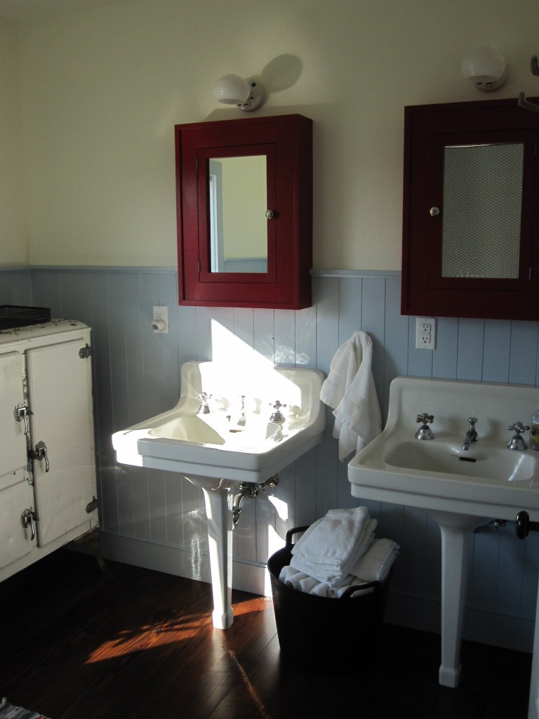 Jennifer made the sconces that flank the medicine cabinets — built-in cabinets she found, one over each sink in both the shared bath and the master. They’re painted, one bathroom red, one blue. The powder room just has a hanging mirror. We probably should have put a medicine cabinet in there too if we’re ever going to use that room as a real bedroom suite, but we didn’t, and that’s a future problem.