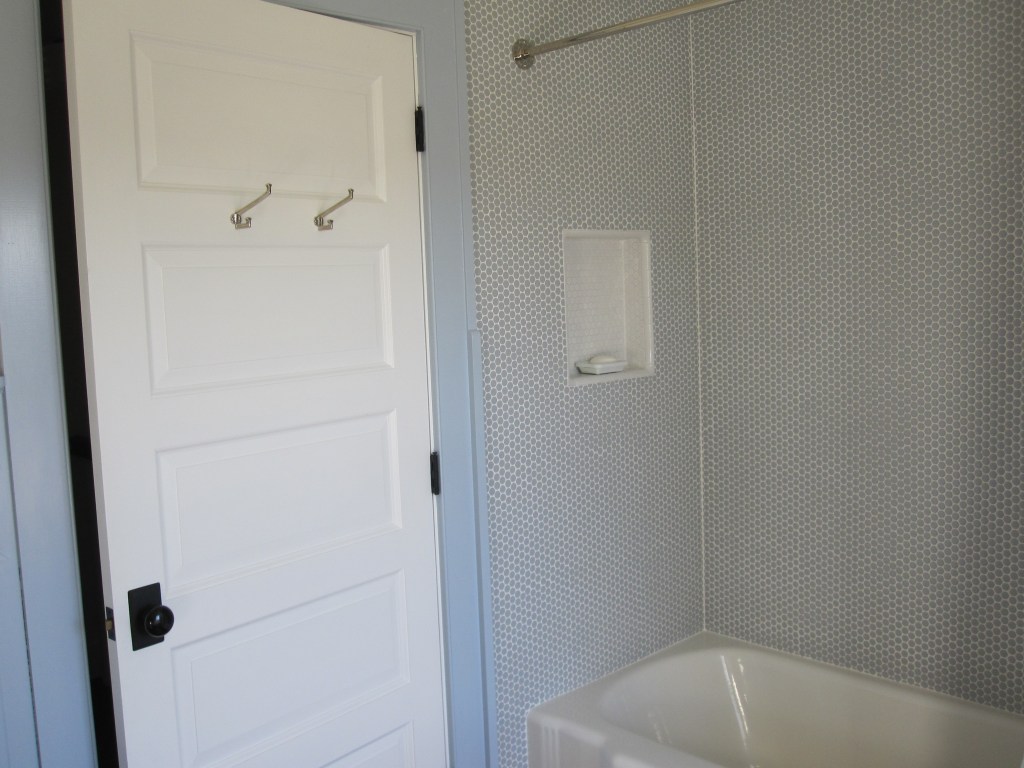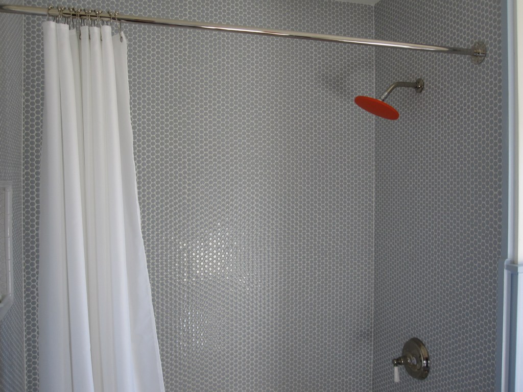 Upstairs in the shared bathroom, Jennifer chose a blue-gray penny tile for the shower. It looks genuinely great. There were installation issues — the thin set wasn’t deep enough at the tub border, so some of the smaller tiles were breaking off where they overlapped the edge, and there was excess grout left behind that had to be scraped out with a flathead screwdriver in a process that was tedious but manageable. I’ve done worse.