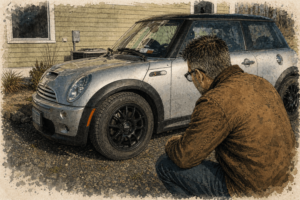 The first real moment of clarity was the Taconic — we had the Mini Cooper S, 2003, and I had already been through a whole thing with that car by that point — stock 17s with run-flats, which were genuinely punishing, and everyone online said just swap to regular tires on the same rims and the ride will transform, so I got Kumhos in 215/45-17 and it was better than the run-flats which is about the most honest thing I can say about it — then I went all the way down to the 15-inch Rota blacks with all-seasons, which people who write about Minis on the internet will tell you is a revelation, and those people are delusional, it was marginally better than the Kumhos on the 17s and my brother told me afterward that you’d really need to swap the shocks to feel an actual difference, which is the kind of useful information that arrives after you’ve already bought two sets of wheels — the car just rode the way it rode and that was that — and I didn’t do dedicated snows for it either, which the Taconic would later have something to say about