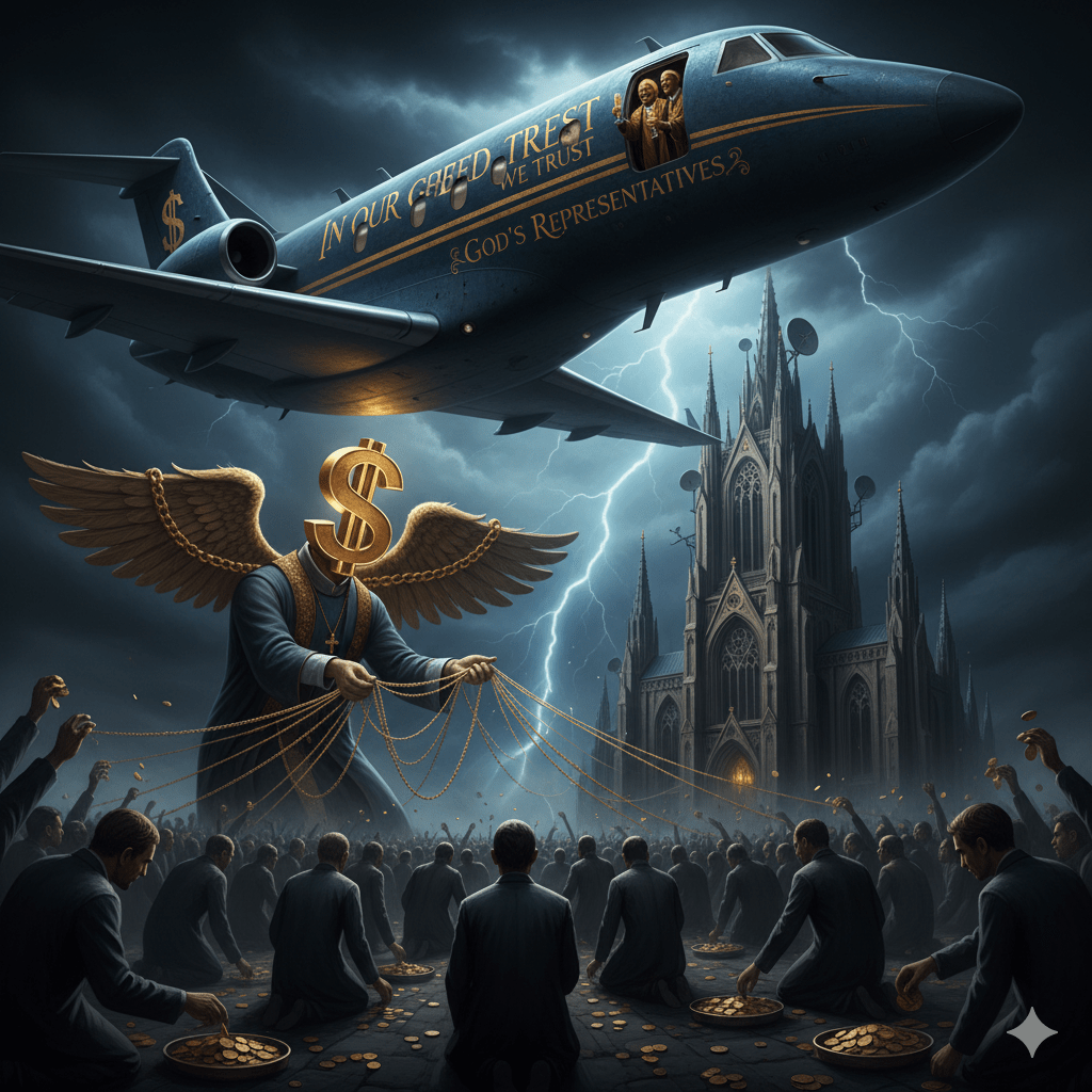 When God’s Representatives Want Private Jets In Part 15, we established that religion can’t be questioned without risking damnation. It’s God’s will. Divine authority. Absolute truth. Now let’s talk about what happens when you combine unquestionable authority with zero financial accountability: the biggest, most profitable con in American history. Kenneth Copeland has a net worth…